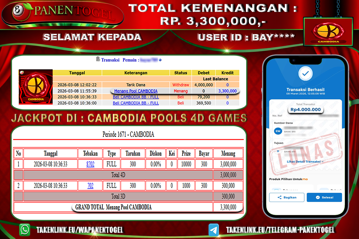 Selamat Kepada User ID : BAY**** Member PANENTOGEL JACKPOT TOGEL CAMBODIA POOLS 4D GAMES