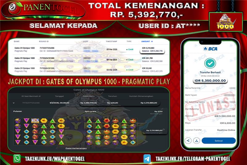 Selamat Kepada User ID : AT**** Member PANENTOGEL JACKPOT GATES OF OLYMPUS 1000