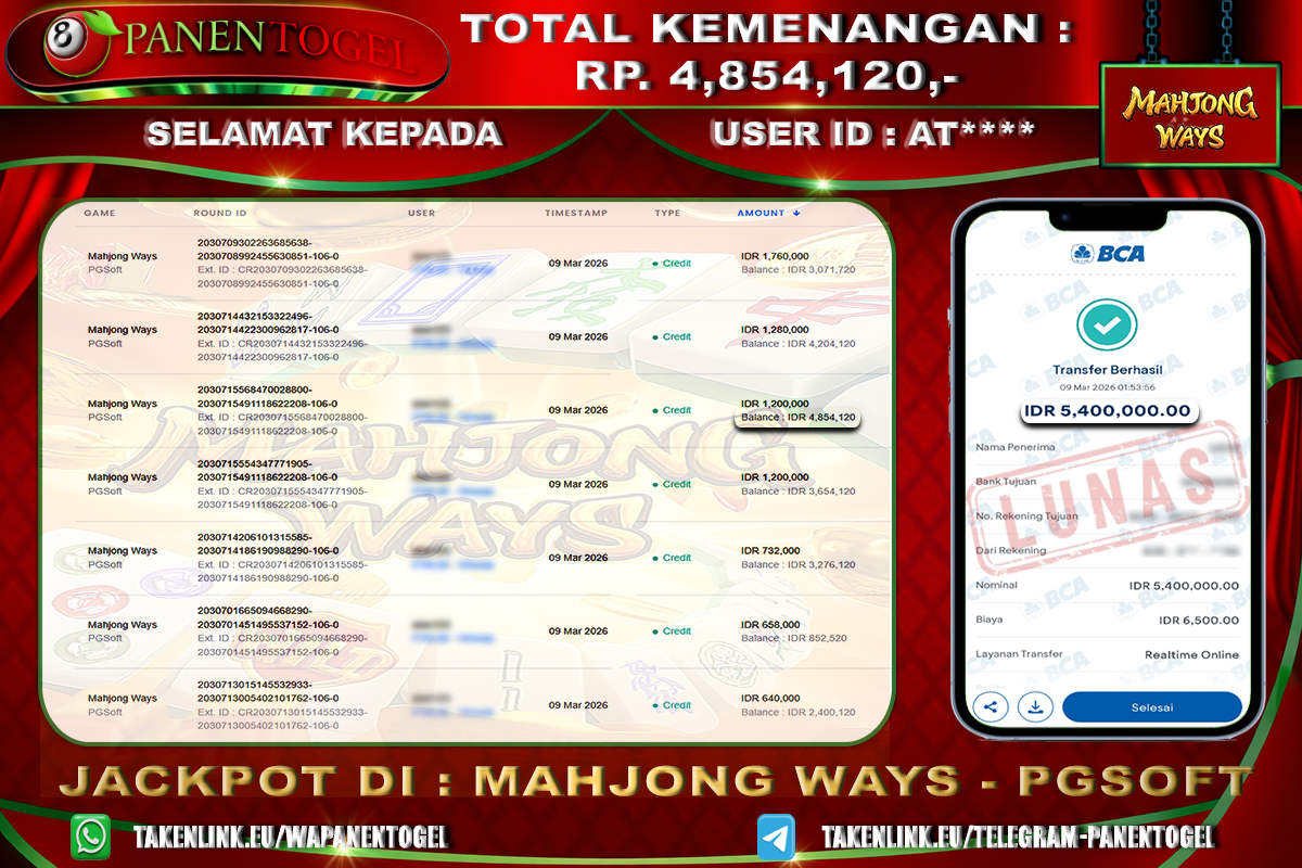 Selamat Kepada User ID : AT**** Member PANENTOGEL JACKPOT MAHJONG WAYS