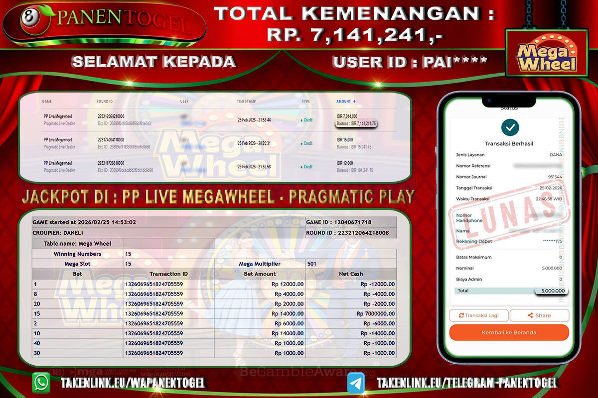 Selamat Kepada User ID : PAI**** Member PANENTOGEL JACKPOT LIVE MEGAWHEEL PRAGMATIC LIVE DEALER