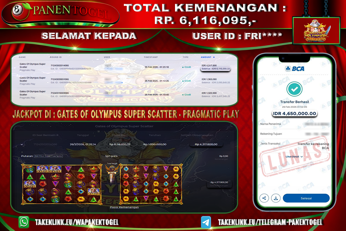 Selamat Kepada User ID : FRI**** Member PANENTOGEL JACKPOT LIVE GATES OF OLYMPUS SUPER SCATTER