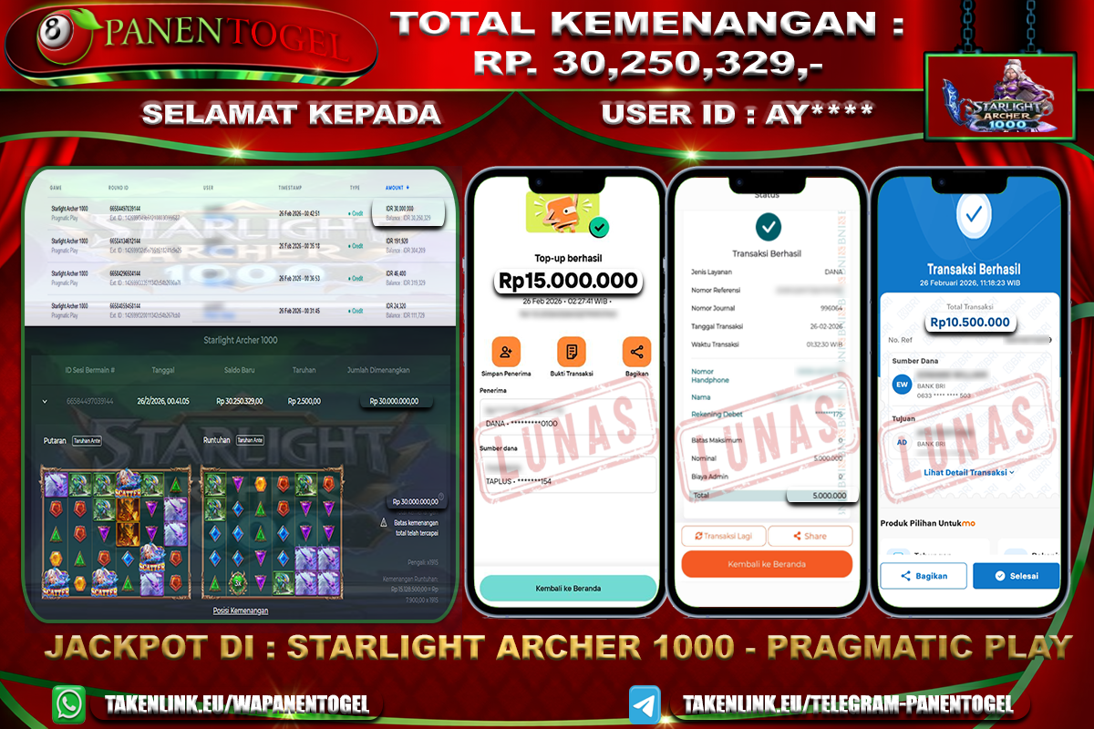 Selamat Kepada User ID : AYU**** Member PANENTOGEL JACKPOT STARLIGHT ARCHER 1000