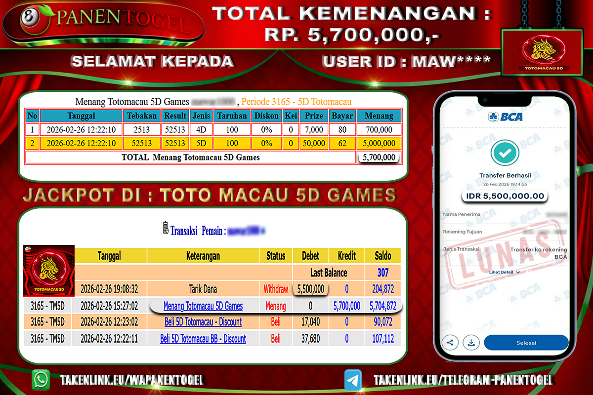Selamat Kepada User ID : MAW**** Member PANENTOGEL JACKPOT TOGEL TOTO MACAU 5D GAMES PANENTOGEL