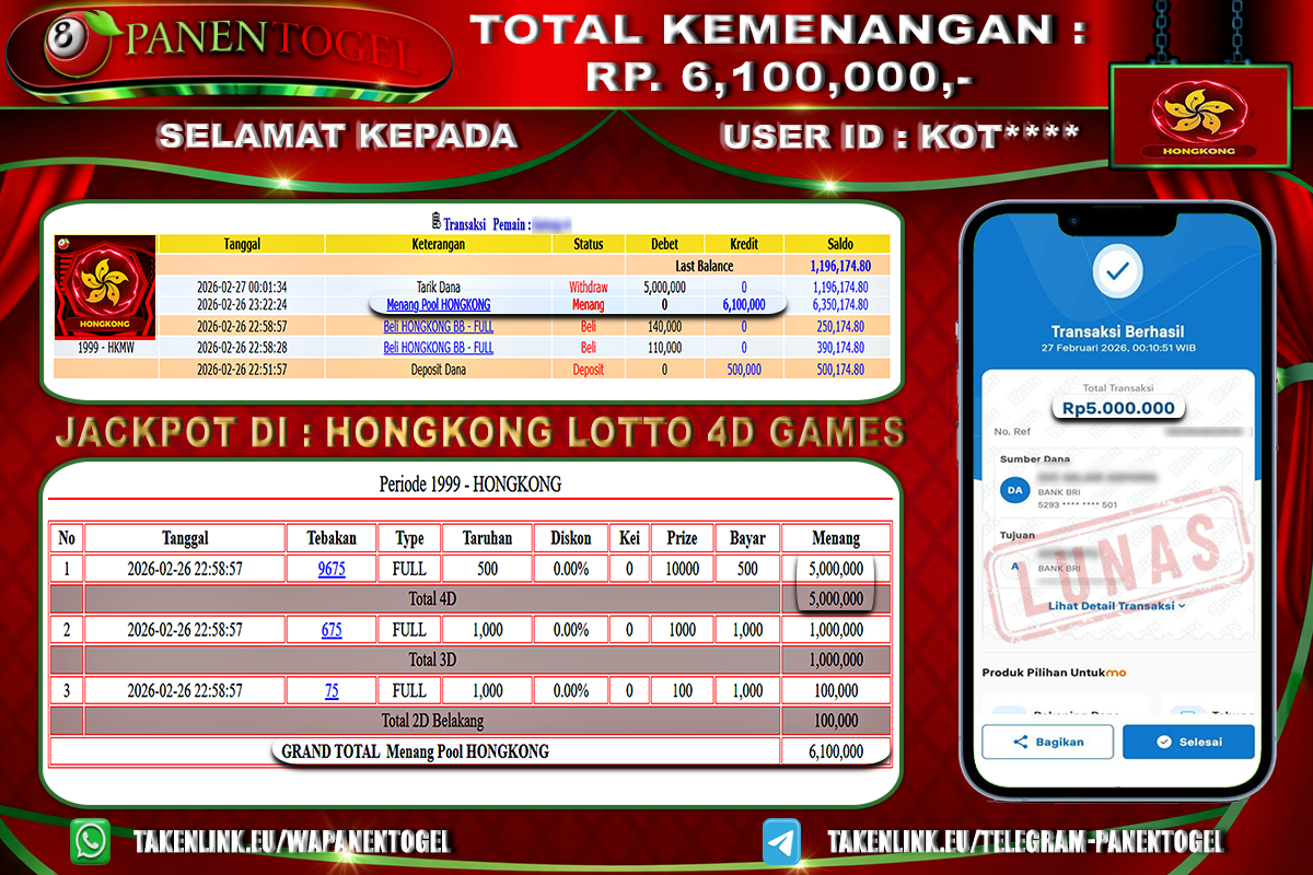 BUKTI KEMENANGAN TOGEL HONGKONG LOTTO 4D GAMES PANENTOGEL Rp. 6.100.000, - LUNAS