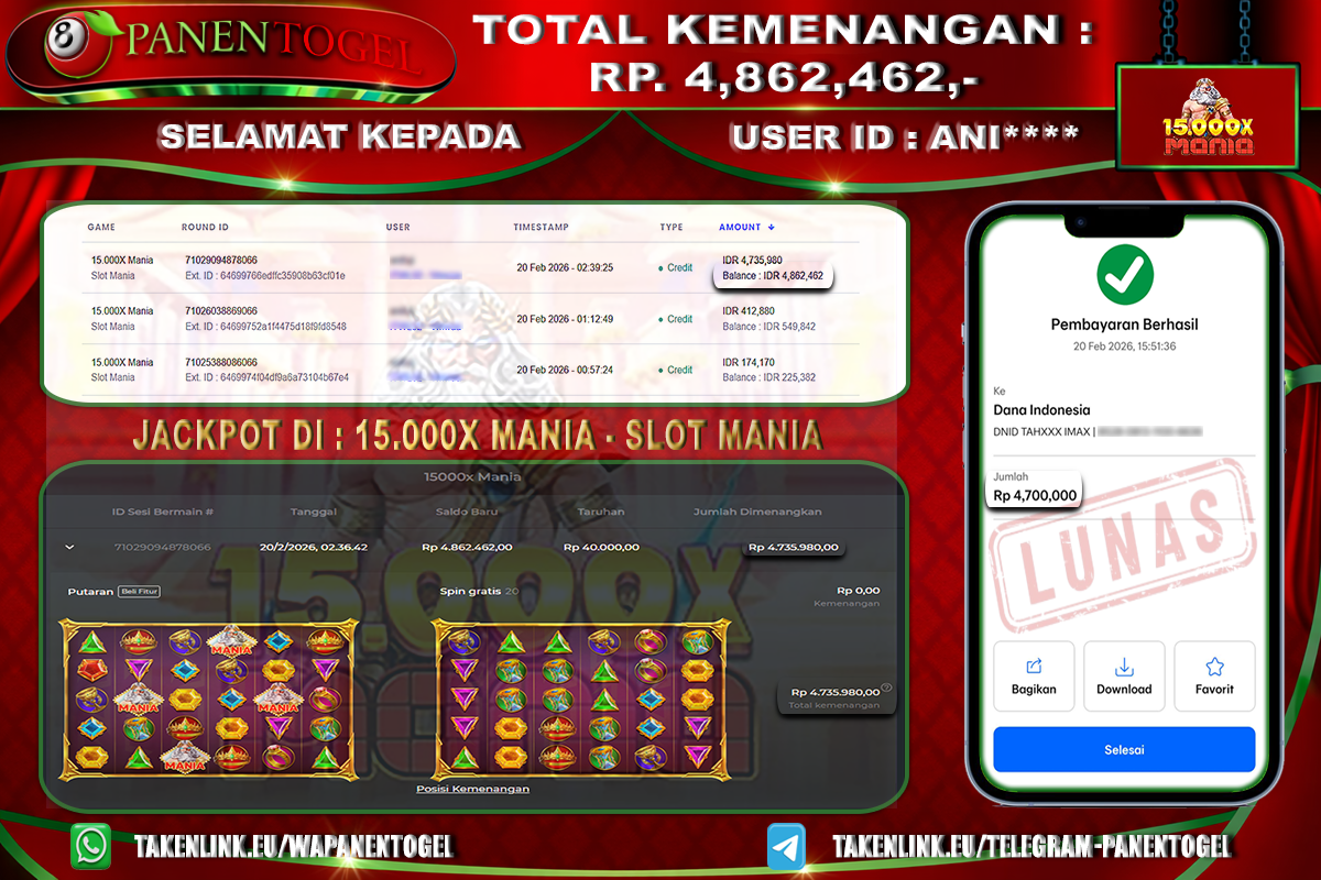 Selamat Kepada User ID : ANI**** Member PANENTOGEL JACKPOT 15.000X MANIA
