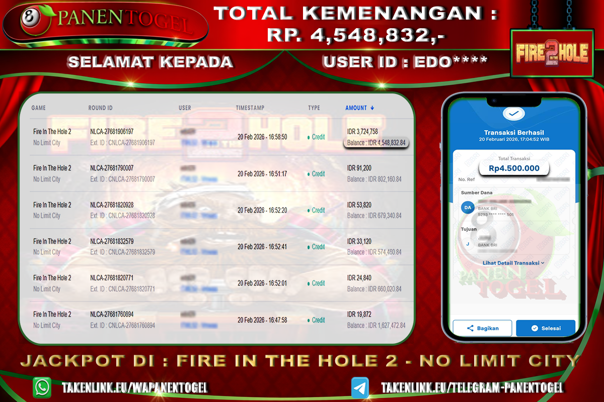 Selamat Kepada User ID : EDO**** Member PANENTOGEL JACKPOT FIRE IN THE HOLE 2