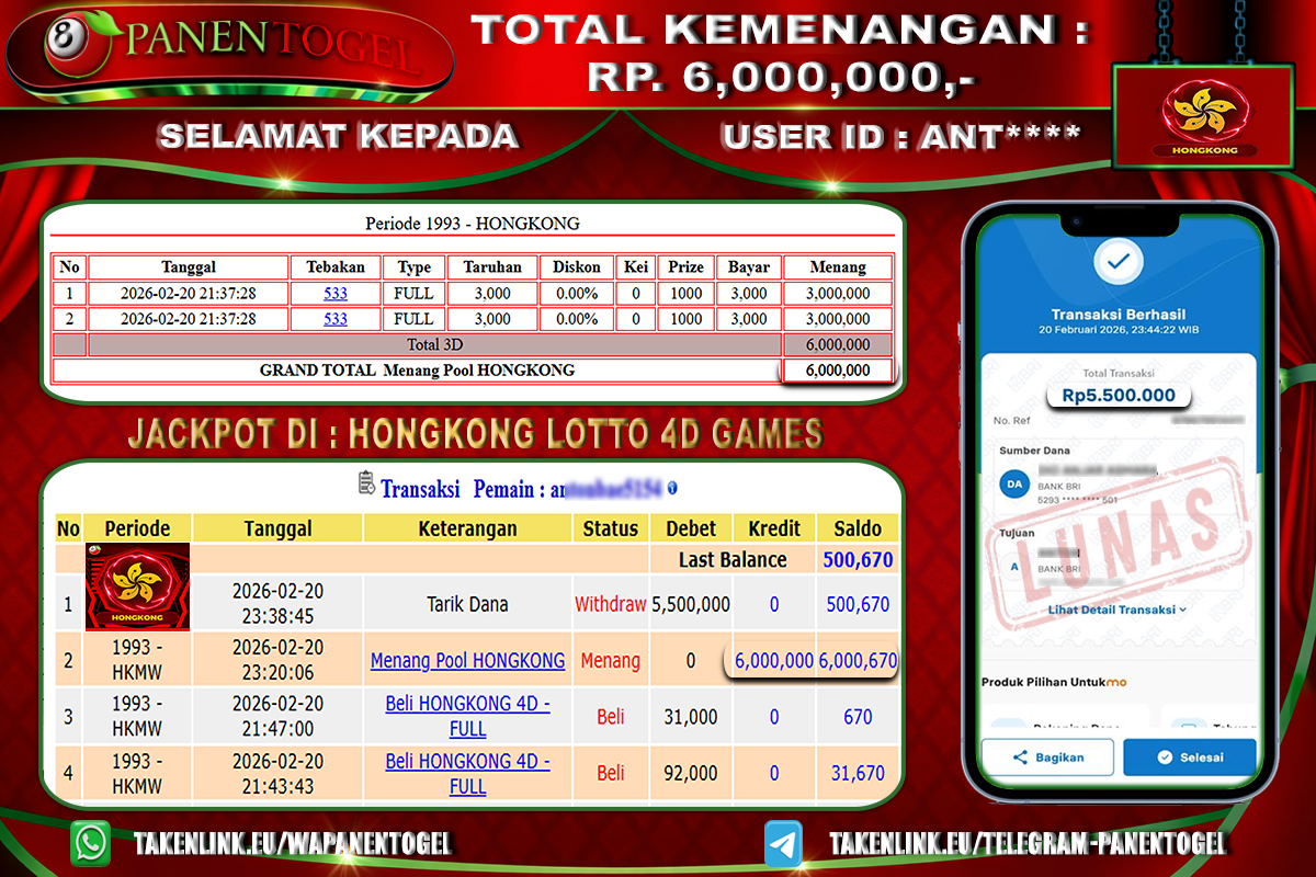 BUKTI KEMENANGAN TOGEL HONGKONG 4D GAMES PANENTOGEL Rp. 6.000.000, - LUNAS