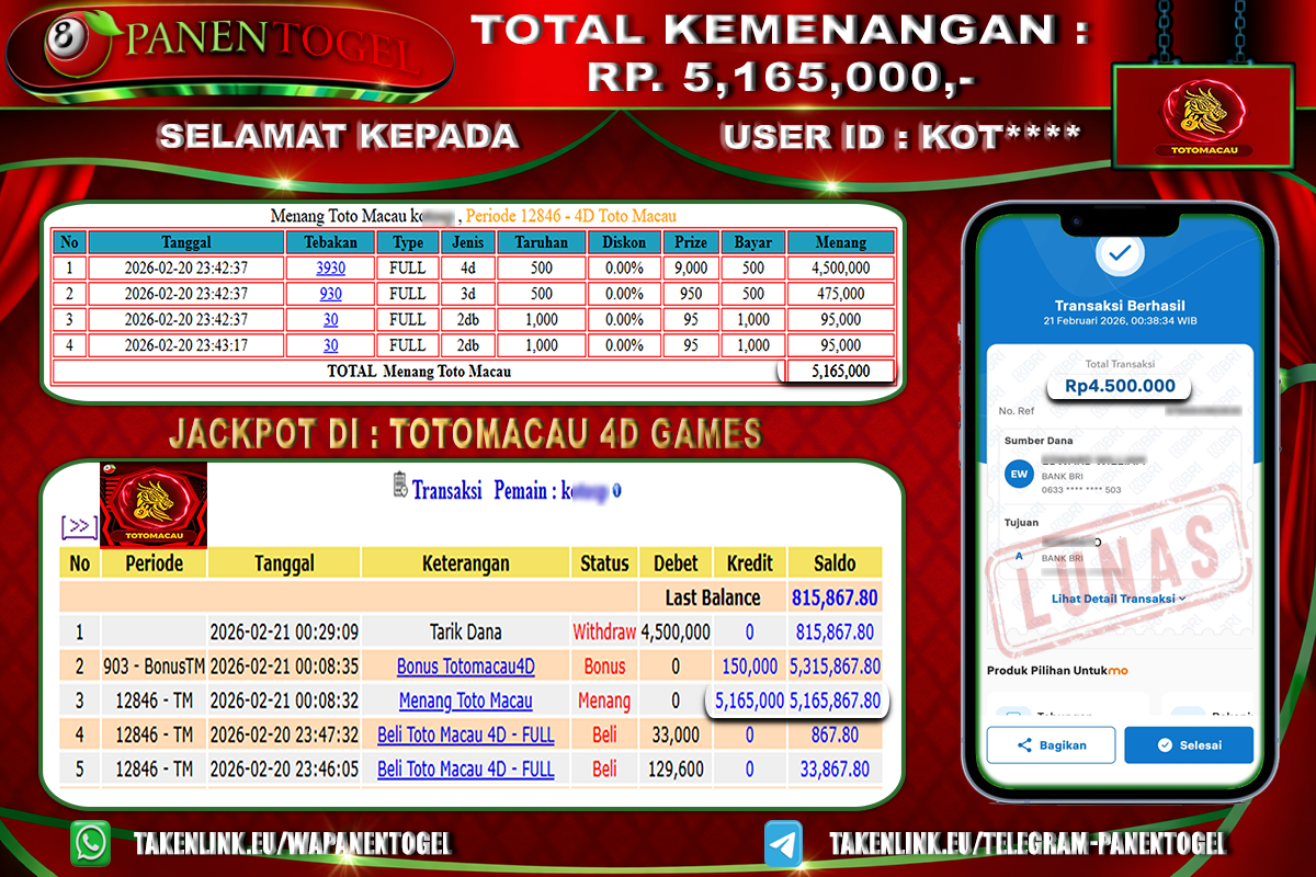 BUKTI KEMENANGAN TOGEL TOTOMACAU 4D GAMES PANENTOGEL Rp. 5.165.000, - LUNAS