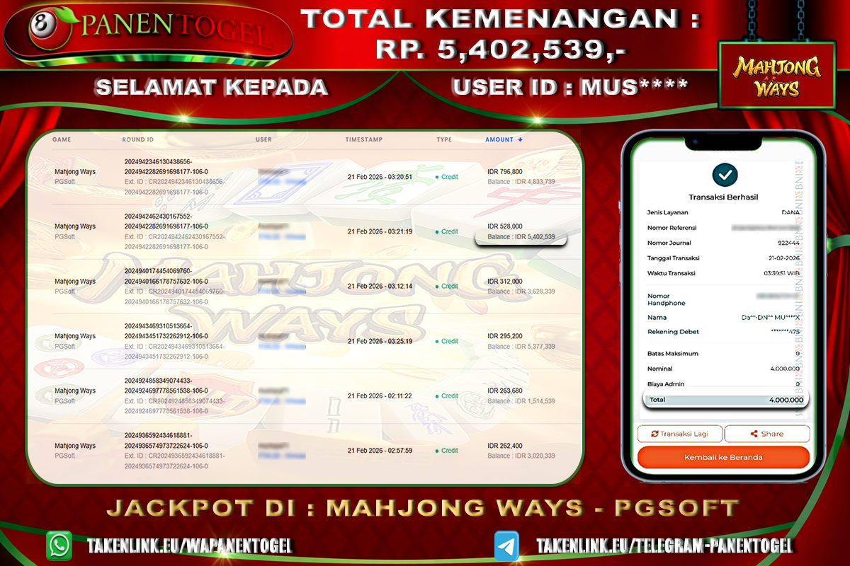 Selamat Kepada User ID : MUS**** Member PANENTOGEL JACKPOT MAHJONG WAYS