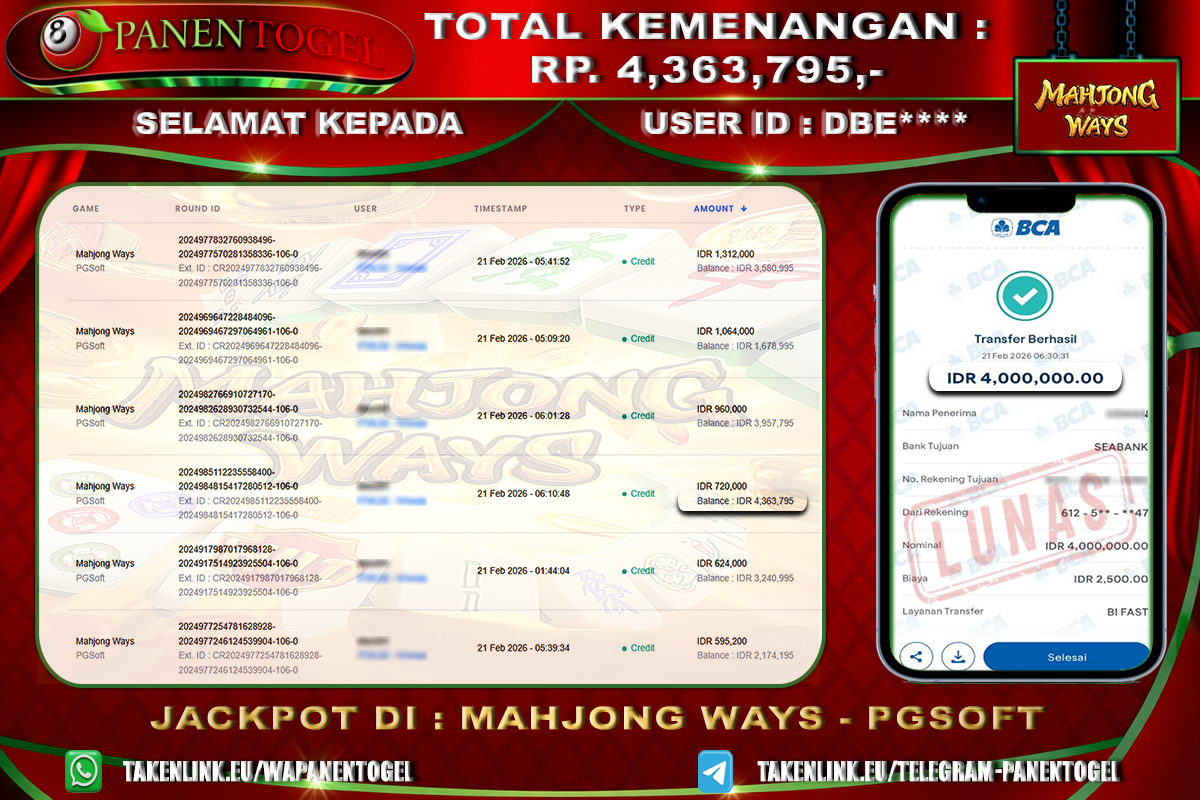 Selamat Kepada User ID : DBE**** Member PANENTOGEL JACKPOT MAHJONG WAYS