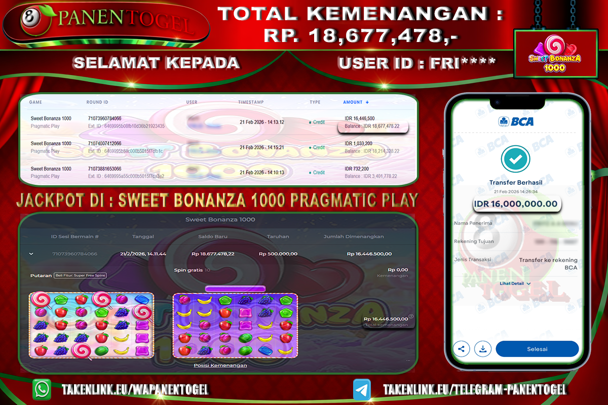 Selamat Kepada User ID : FRI**** Member PANENTOGEL SWEET BONANZA 1000