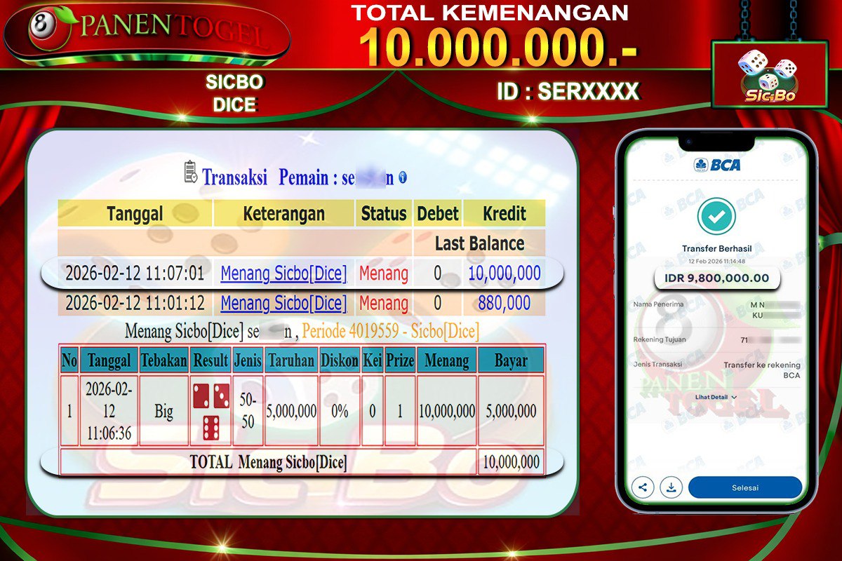 Selamat Kepada User ID : SER**** Member PANENTOGEL JACKPOT LIVE GAME SICBO DICE