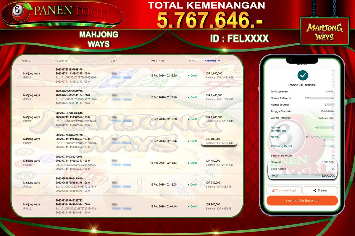 Selamat Kepada User ID : FEL**** Member PANENTOGEL JACKPOT MAHJONG WAYS