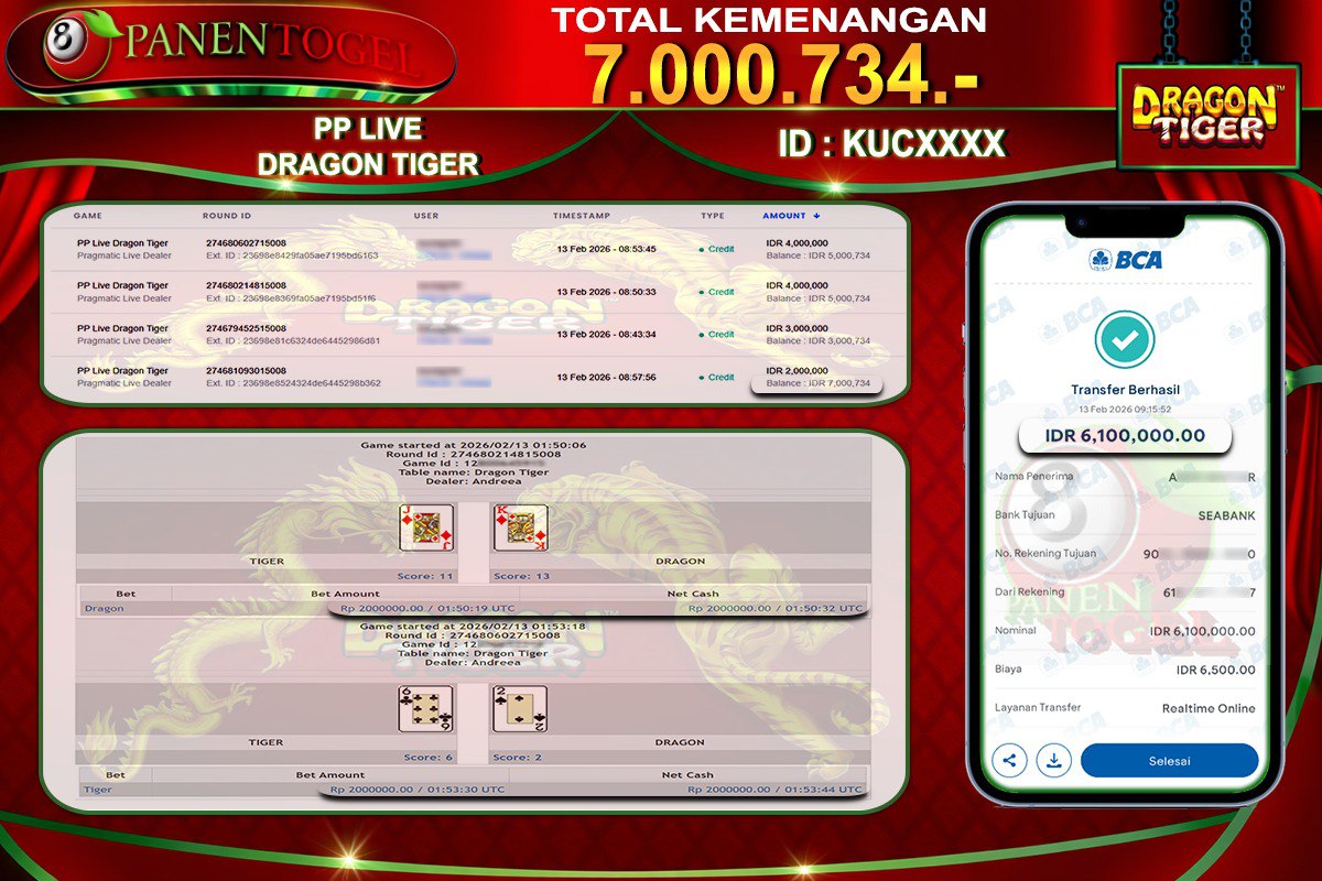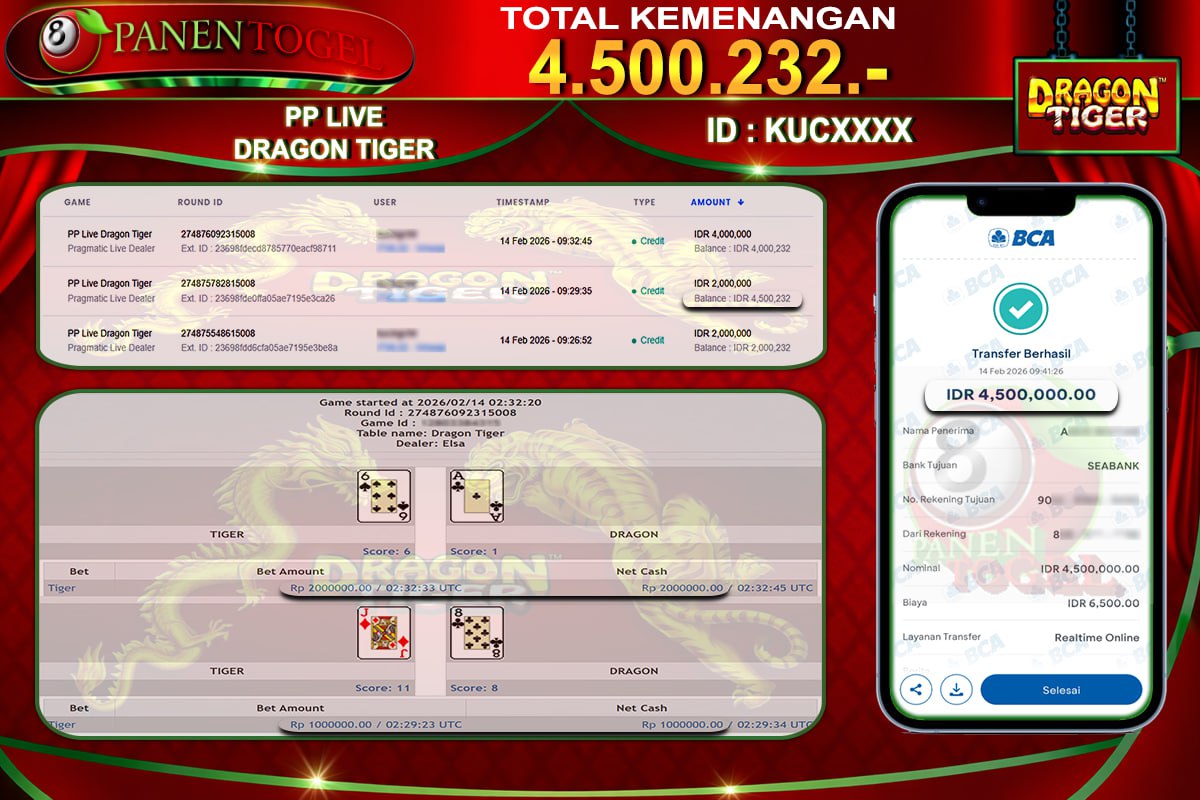 Selamat Kepada User ID : KUC**** Member PANENTOGEL JACKPOT PP LIVE DRAGON TIGER