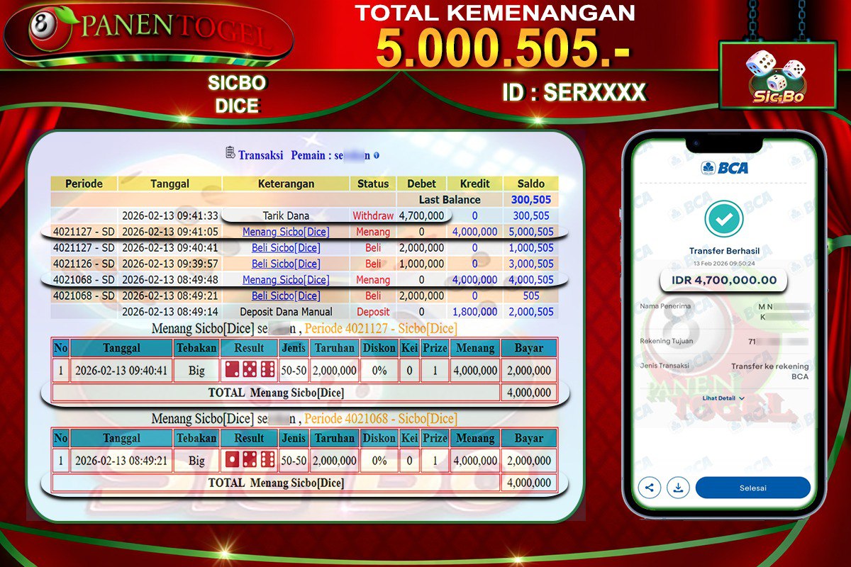 BUKTI KEMENANGAN LIVE GAME SICBO DICE PANENTOGEL Rp. 5.000.505, - LUNAS