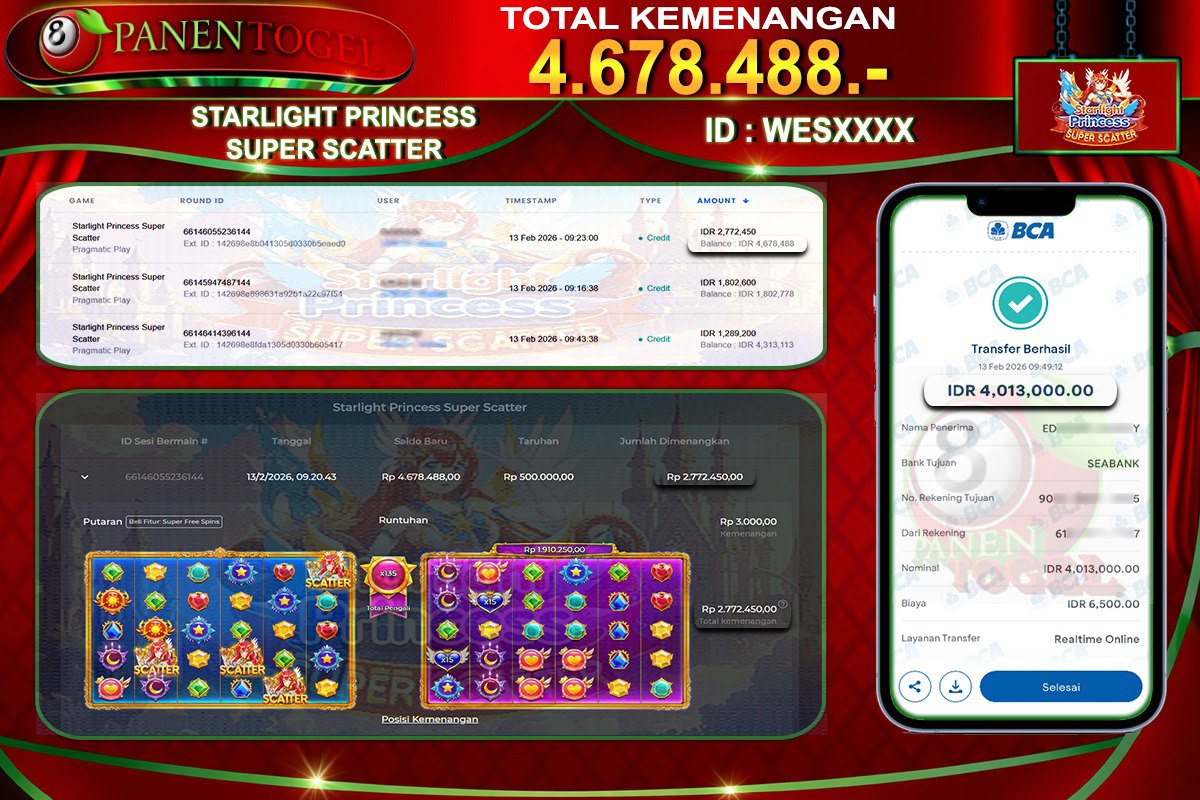 Selamat Kepada User ID : WES**** Member PANENTOGEL JACKPOT STARLIGHT PRINCESS SUPER SCATTER