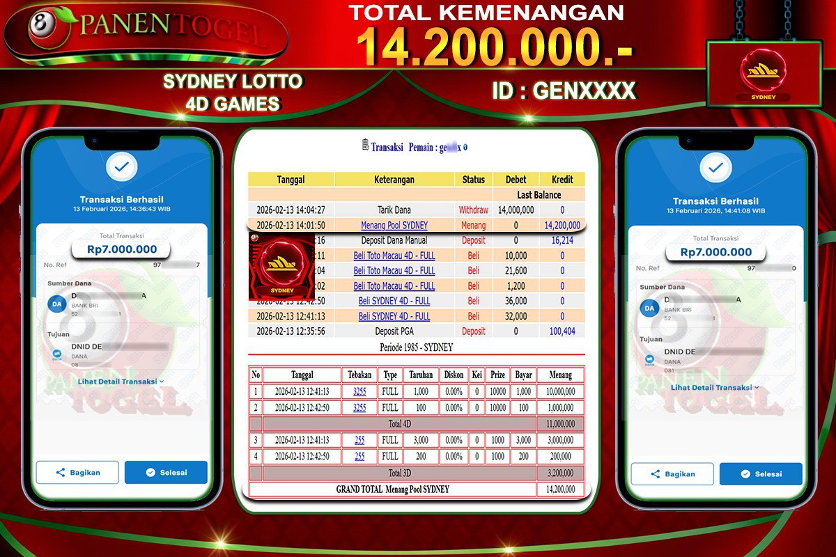 BUKTI KEMENANGAN TOGEL SYDNEY LOTTO PANENTOGEL Rp. 14.200.000, - LUNAS