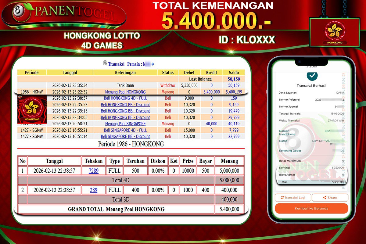 BUKTI KEMENANGAN TOGEL HONGKONG LOTTO PANENTOGEL Rp. 5.400.000, - LUNAS