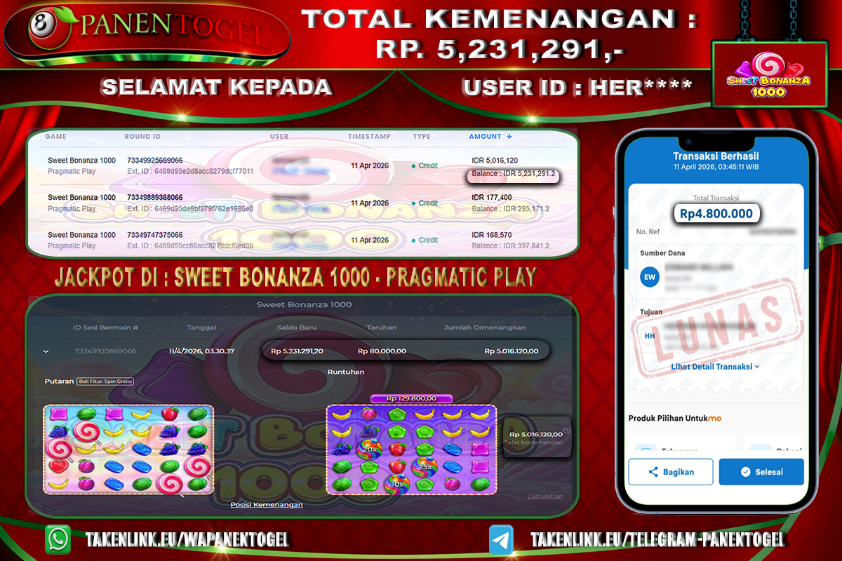 Selamat Kepada User ID : HER**** Member PANENTOGEL JACKPOT SWEET BONANZA 1000