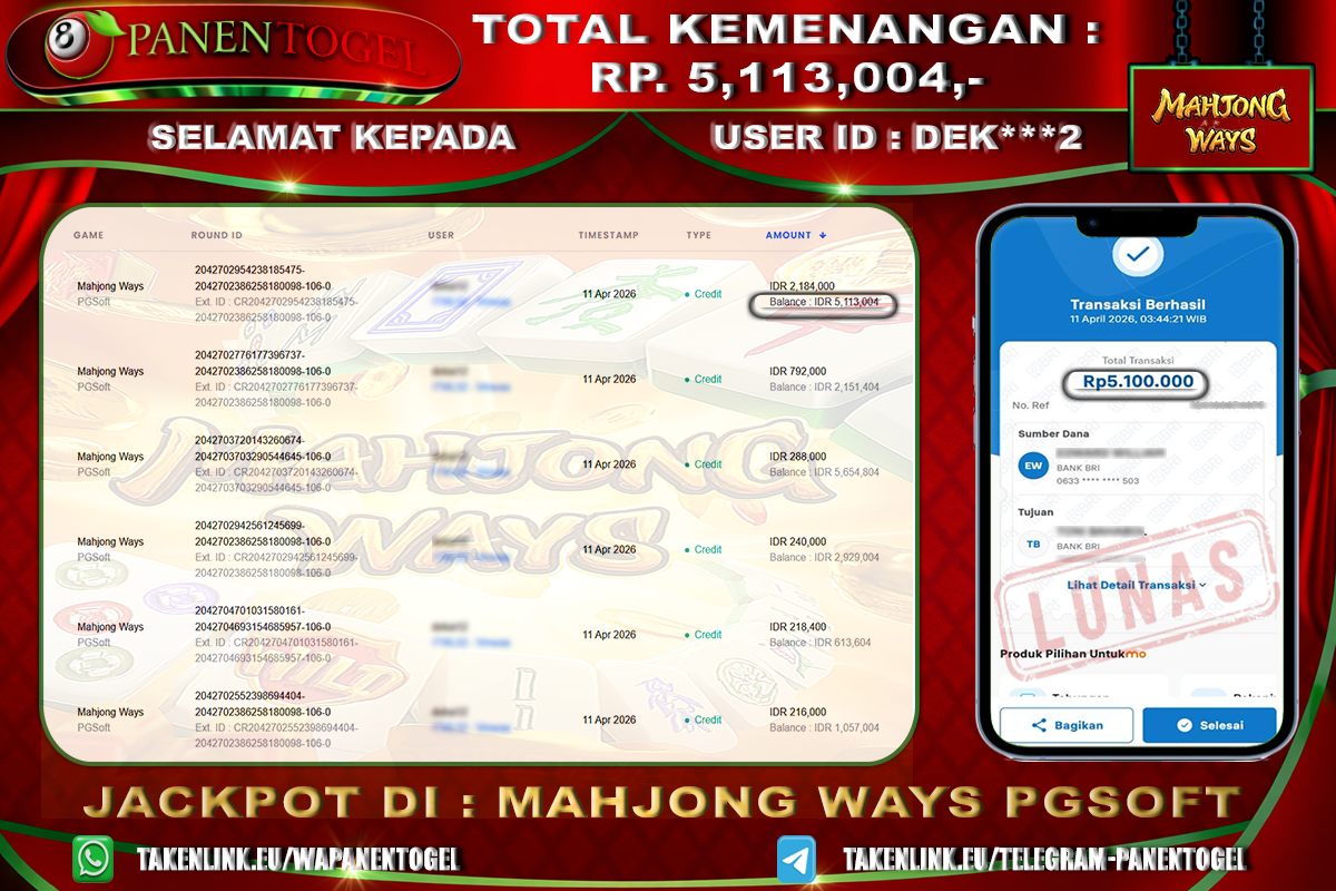 BUKTI KEMENANGAN SLOT PANENTOGEL Rp. 5.113.004, - LUNAS