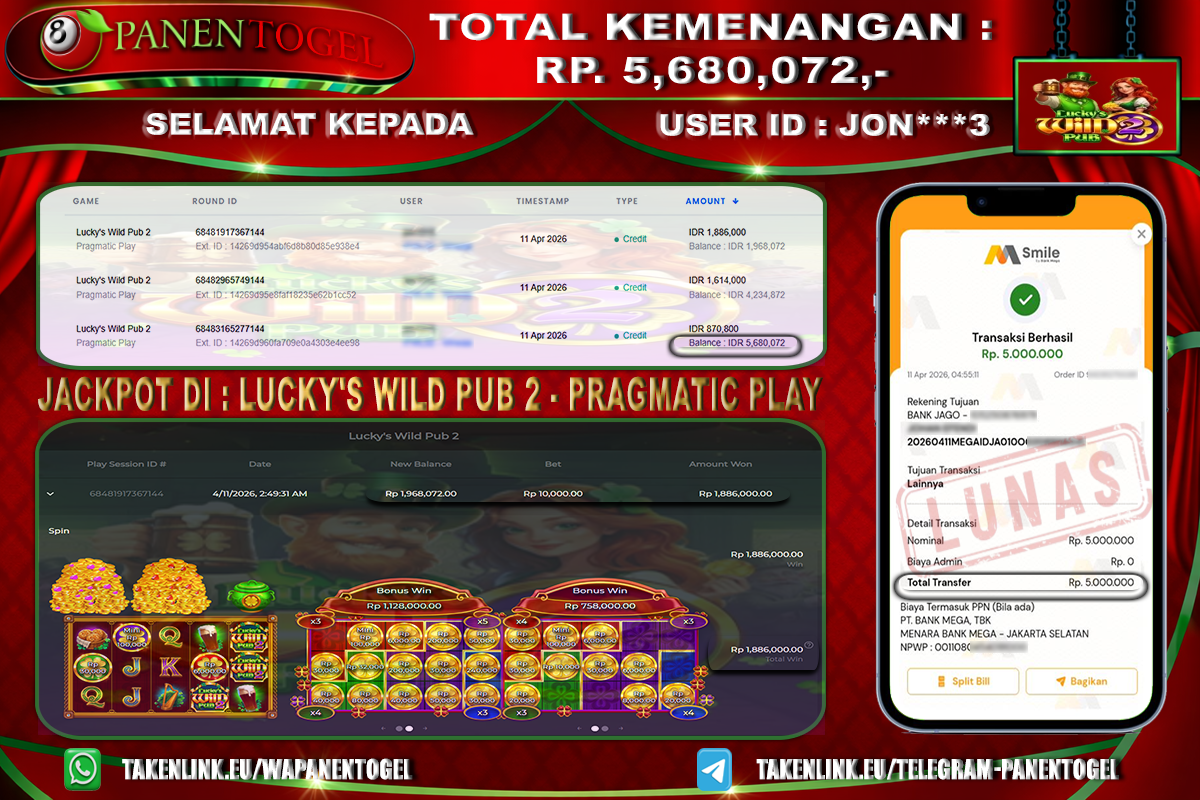 Selamat Kepada User ID : JON***3 Member PANENTOGEL JACKPOT LUCKY'S WILD PUB 2