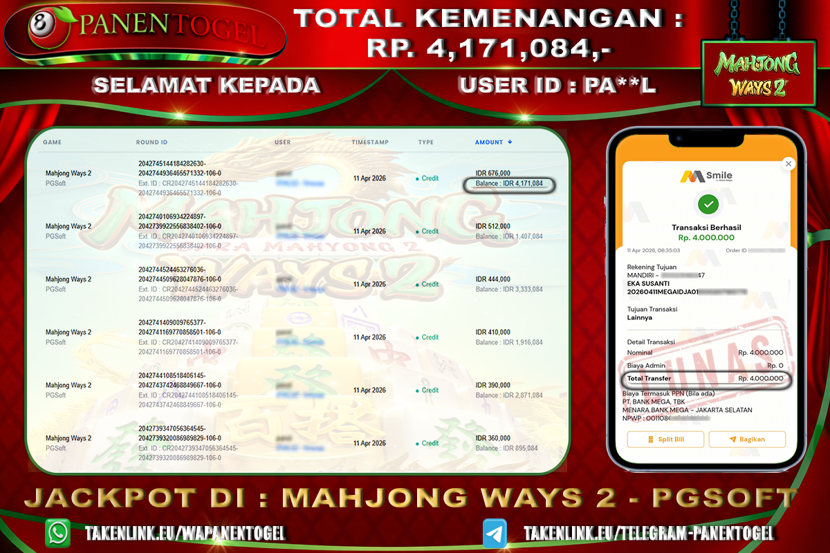 Selamat Kepada User ID : PAL***L Member PANENTOGEL JACKPOT MAHJONG WAYS 2