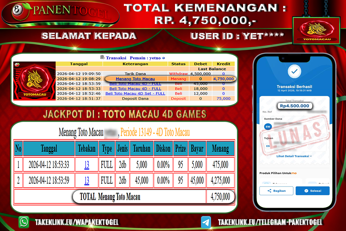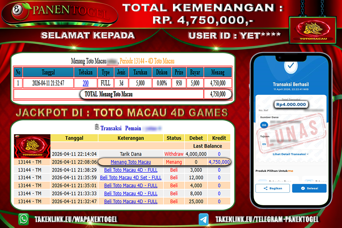 BUKTI KEMENANGAN TOGEL TOTO MACAU 4D Rp. 4.750.000, - LUNAS