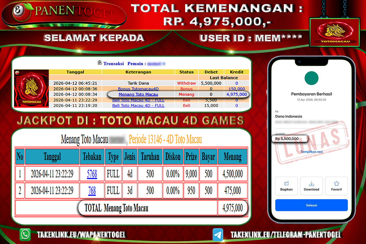 BUKTI KEMENANGAN TOGEL TOTO MACAU 4D GAMES PANENTOGEL Rp. 4.975.000, - LUNAS