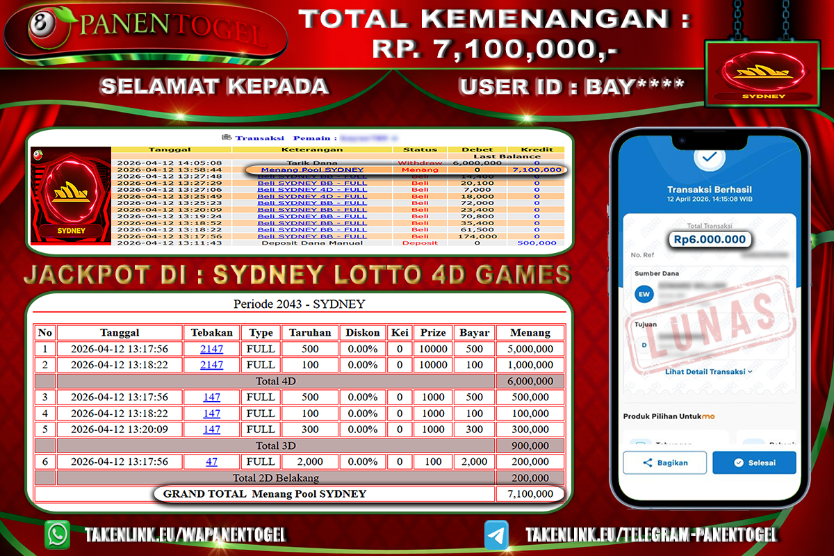Selamat Kepada User ID : BAY**** Member PANENTOGEL JACKPOT TOGEL SYDNEY LOTTO