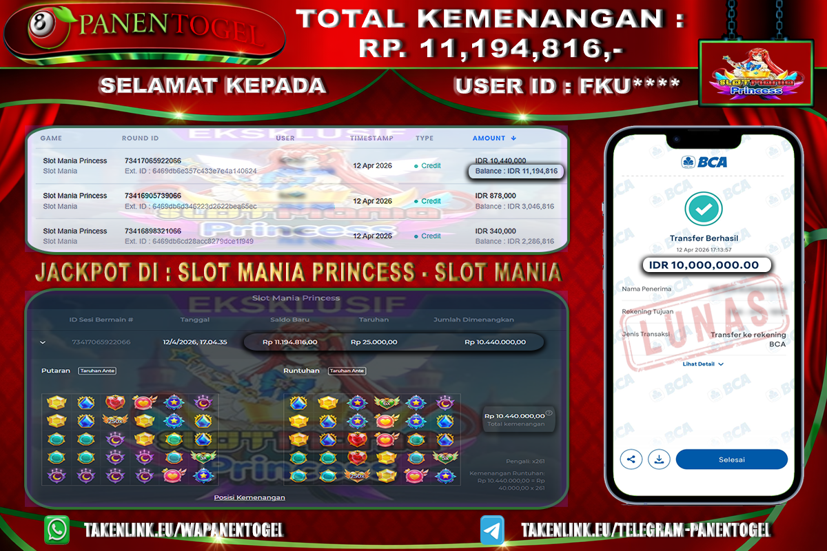 Selamat Kepada User ID : FKU**** Member PANENTOGEL JACKPOT MANIA PRINCESS