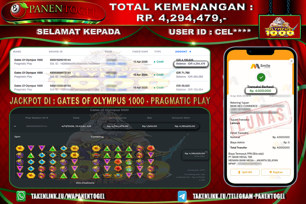 Selamat Kepada User ID : CEL**** Member PANENTOGEL JACKPOT GATES OF OLYMPUS 1000 PRAGMATIC PLAY
