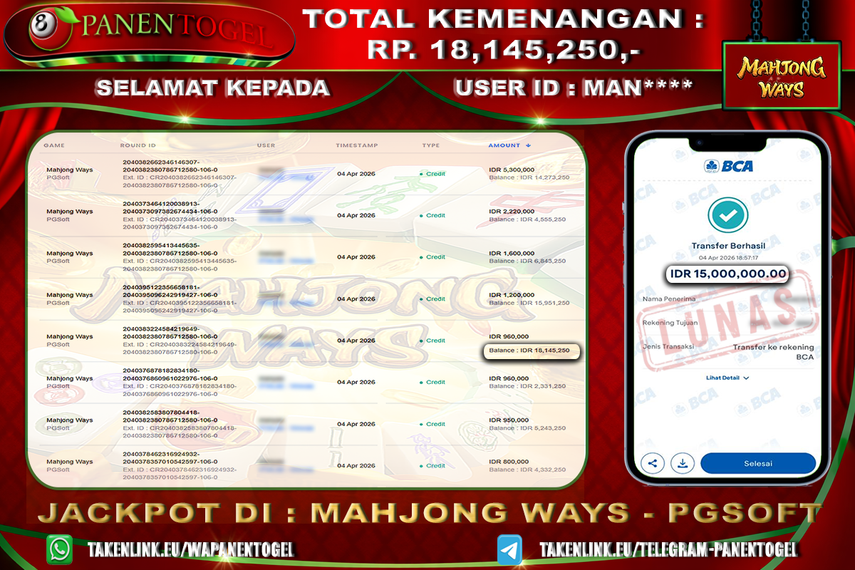 Selamat Kepada User ID : MAN**** Member PANENTOGEL JACKPOT MAHJONG WAYS