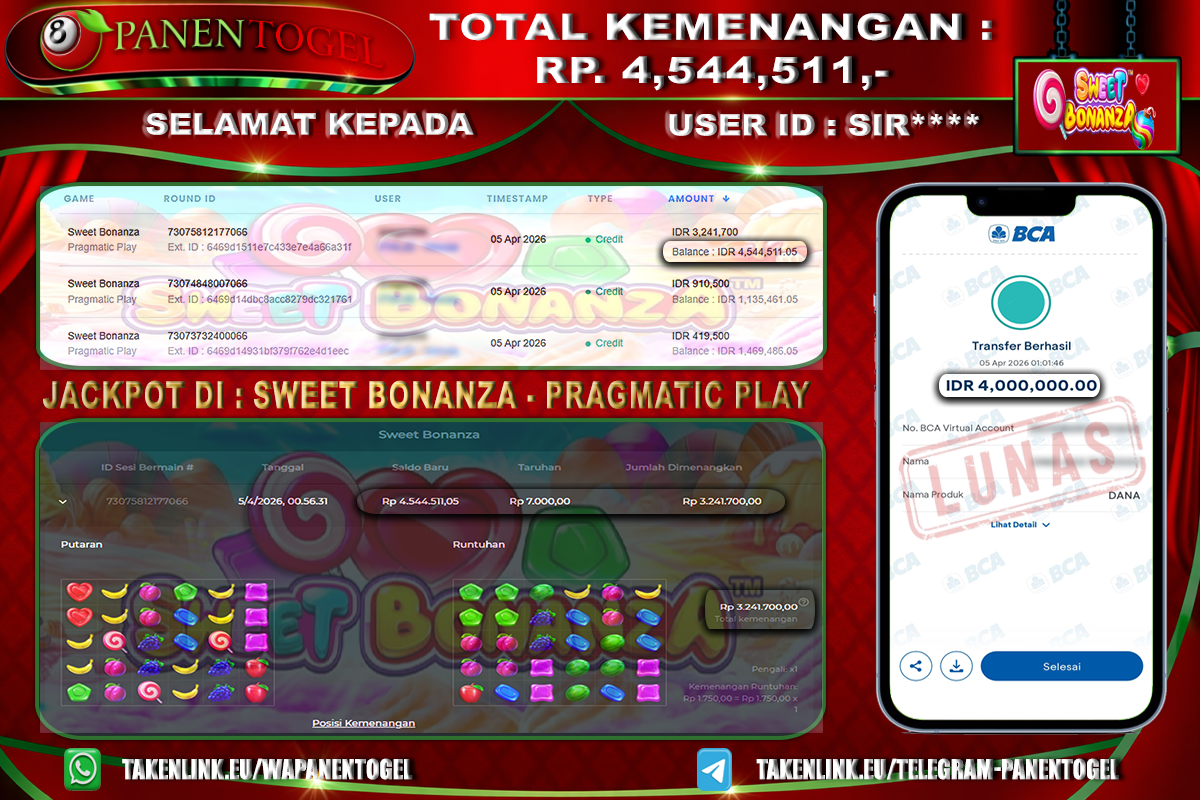 Selamat Kepada User ID : SIR**** Member PANENTOGEL JACKPOT SWEET BONANZA