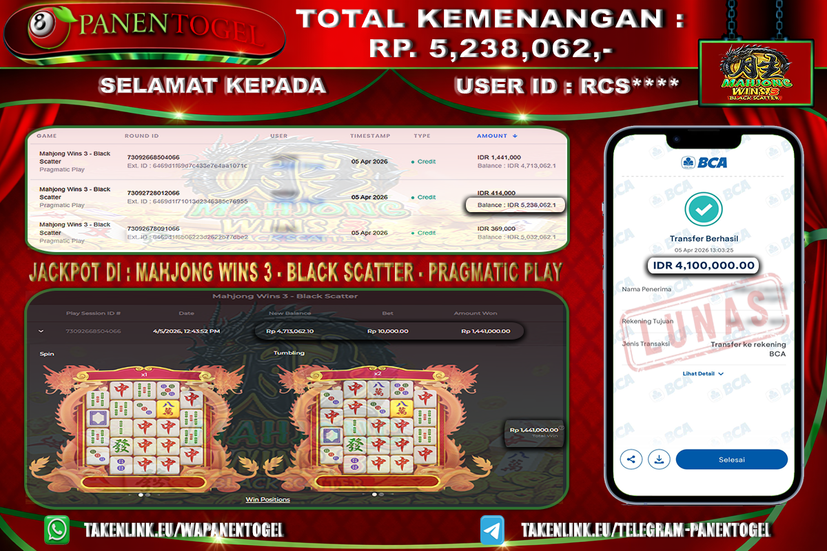 Selamat Kepada User ID : RCS**** Member PANENTOGEL JACKPOT MAHJONG WINS 3 BLACK SCATTER