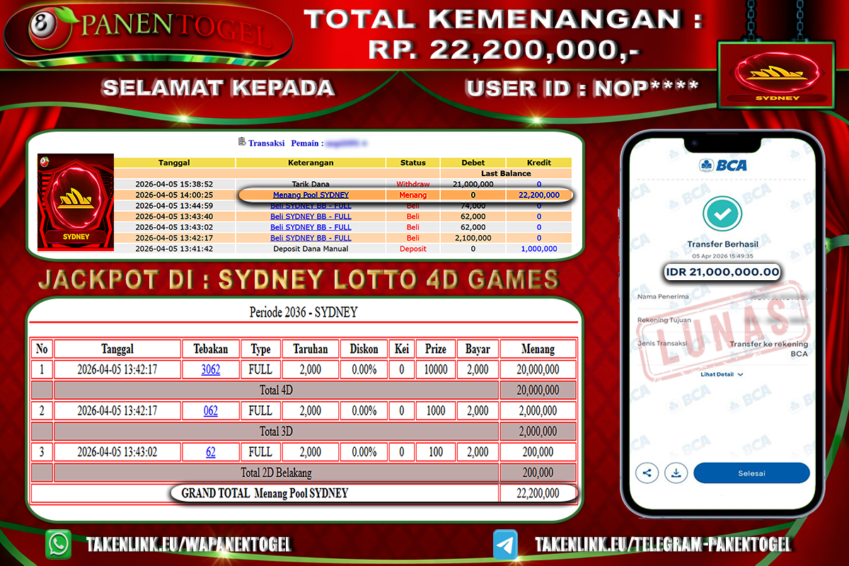 Selamat Kepada User ID : NOP**** Member PANENTOGEL JACKPOT TOGEL SYDNEY LOTTO