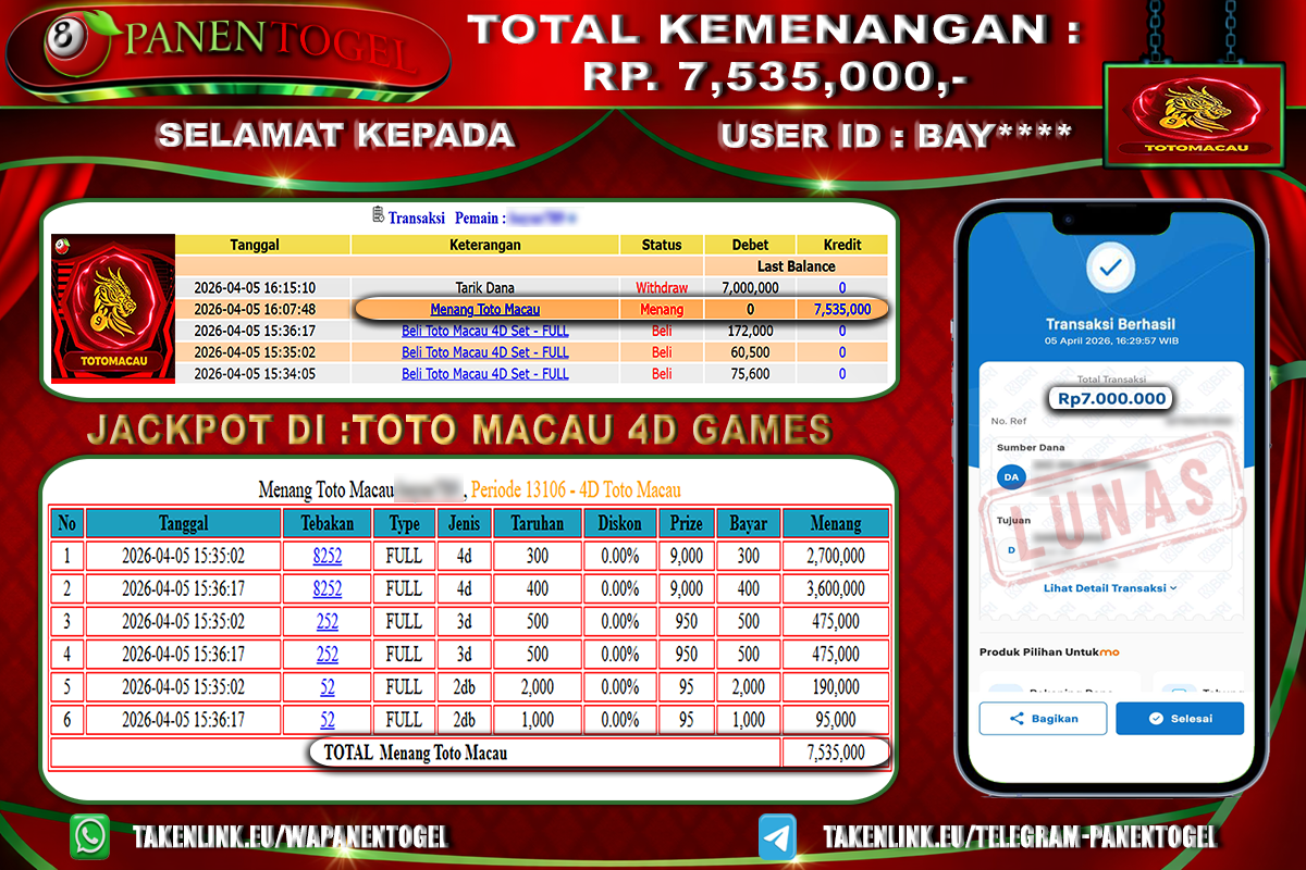 BUKTI KEMENANGAN TOGEL TOTO MACAU 4D GAMES PANENTOGEL Rp. 7.535.000, - LUNAS