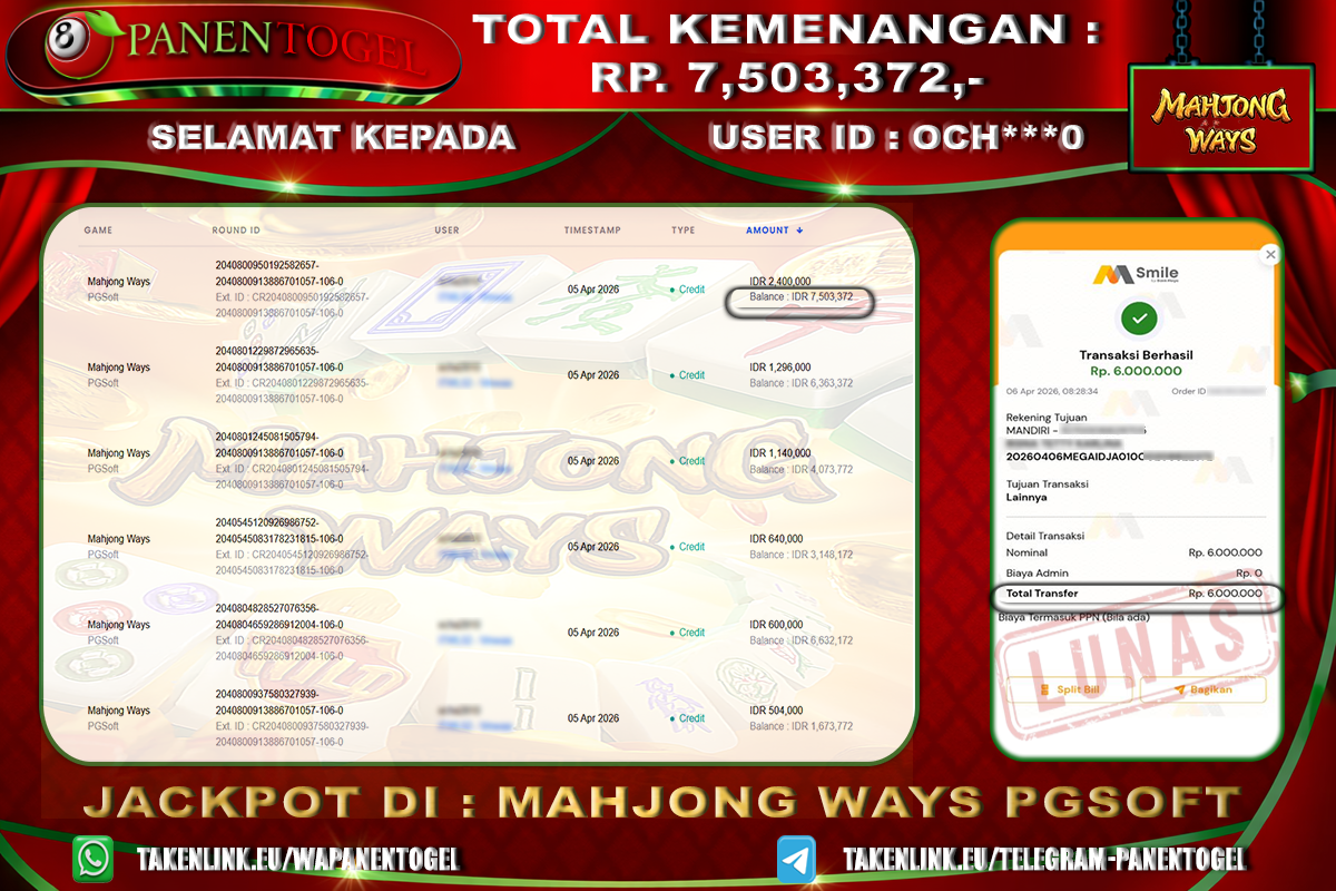 Selamat Kepada User ID : OCH***0 Member PANENTOGEL JACKPOT MAHJONG WAYS